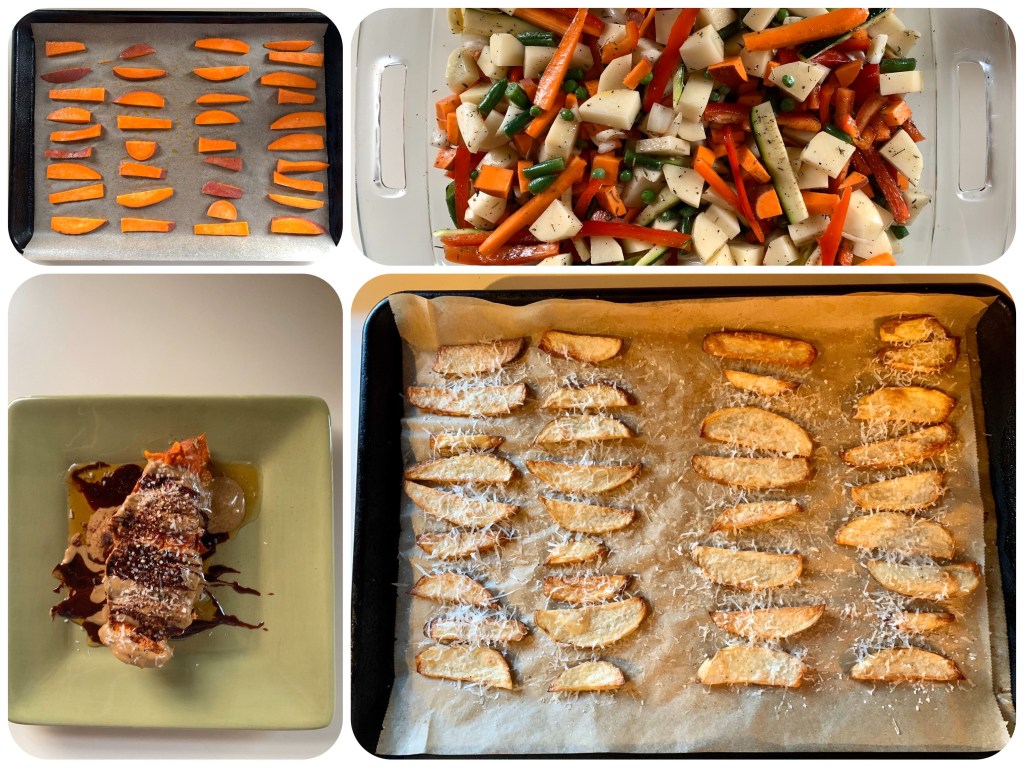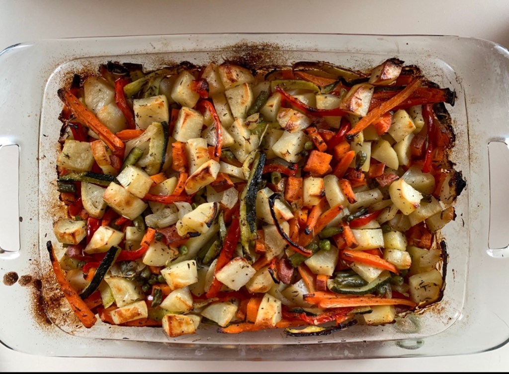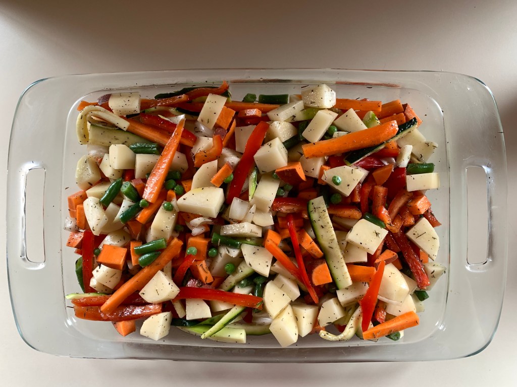Preheat the oven to 400 degrees. Wash and chop veggies, set to the side. Wash and peel potatoes (*peeling is optional). Chop potatoes into chunks, as big or small as you like. Add all of the potatoes and veggies to a large baking dish. Add a splash of water to prevent sticking and help add more steam when baking. Drizzle olive/coconut oil, toss to coat everything evenly (I tend to just mix with my hands). Add salt and other spices of your choice, mix again. Cover with foil (this helps it cook more evenly, especially when making a bigger batch). Bake for about 60 minutes. Remove foil and bake for another 10-20 minutes or until done.