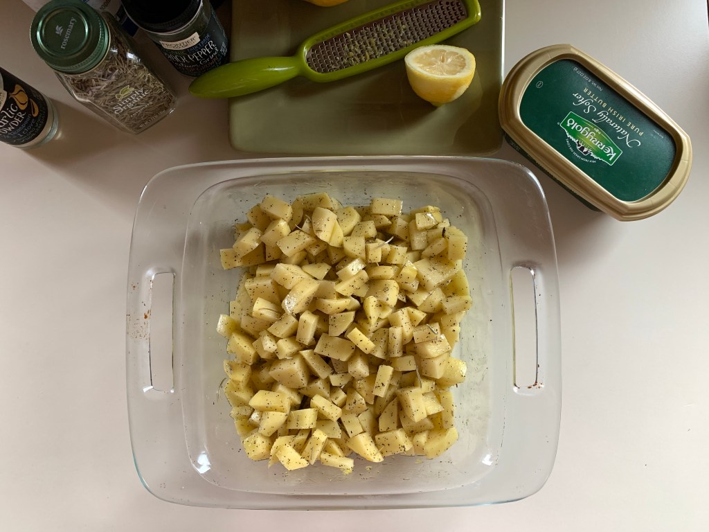 Preheat the oven to 400 degrees. Wash lemon in hot water and zest. Hot water will remove any wax. Wash and peel potatoes (*peeling is optional). Cut potatoes into chunks, as small or large as you want, then put into a baking dish. Add oil/butter, spices, and lemon juice. Toss to coat evenly. Cover baking dish with foil (*optional, but I find it cooks more evenly this way). Bake for 45-60 minutes. *Remove foil and put back in the oven for another 10-15 minutes to crisp up the top of the potatoes. Sprinkle the lemon zest over potatoes before serving.