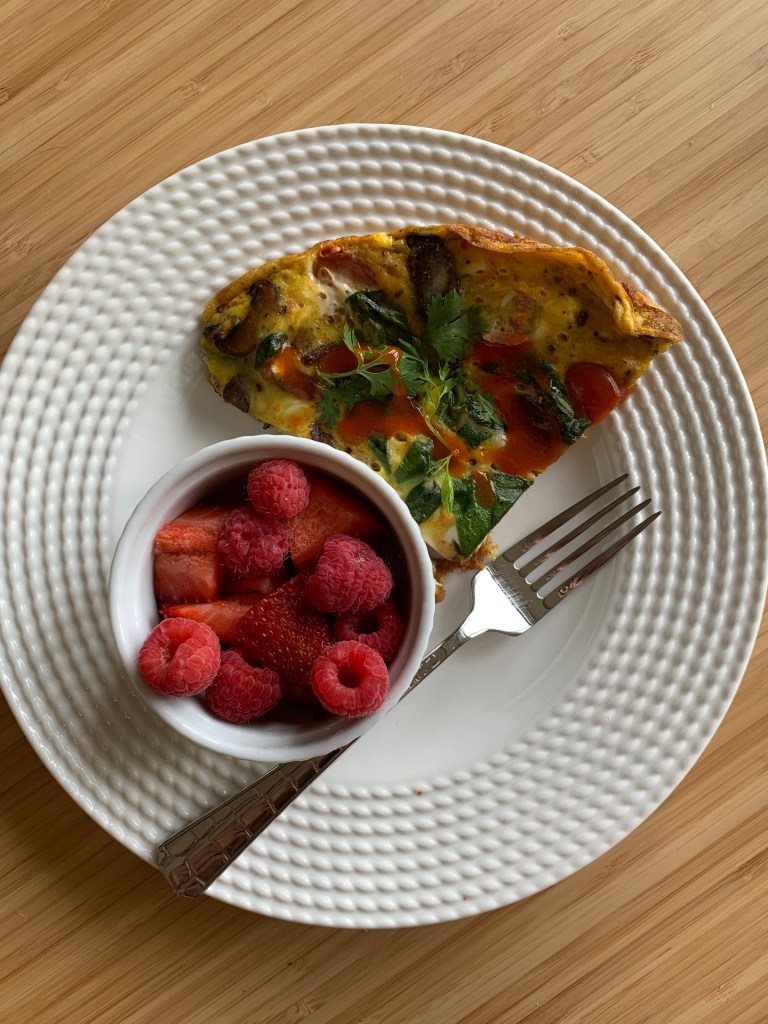 In a pan with a lid, preferably see-through, add two teaspoons of olive oil and heat over medium. Add onions and cook for about a minute, then add garlic, mushrooms, and tomatoes. Stir and cook for about three minutes or until veggies are cooked through. Add seasonings, like Italian seasoning, salt, pepper, red pepper flakes, or dill. Taste one of the vegetables to make sure they are flavored enough. Add spinach, stir once more and put lid on pot while you beat the eggs. Beat 4-5 eggs in a separate bowl and season with salt and pepper. Make sure all vegetables are cooked to your preferred done-ness. Add a little more olive oil to the pan if pan looks dry. Keeping heat at medium, add eggs and stir mixture for a few seconds to create an even layer of vegetables. If the eggs don’t slightly cover the vegetables, beat one more egg and add. Turn heat to low and cover with lid for 5-7 minutes. If after seven minutes the eggs are still not set, turn heat back up to medium and cook for about 2 minutes, keeping an eye on them. The eggs should turn a lighter color and the top should not look shiny with uncooked egg. Turn off heat and let sit with lid still on for about a minute. Slice and serve. Leftovers hold up really well for a few days in fridge.