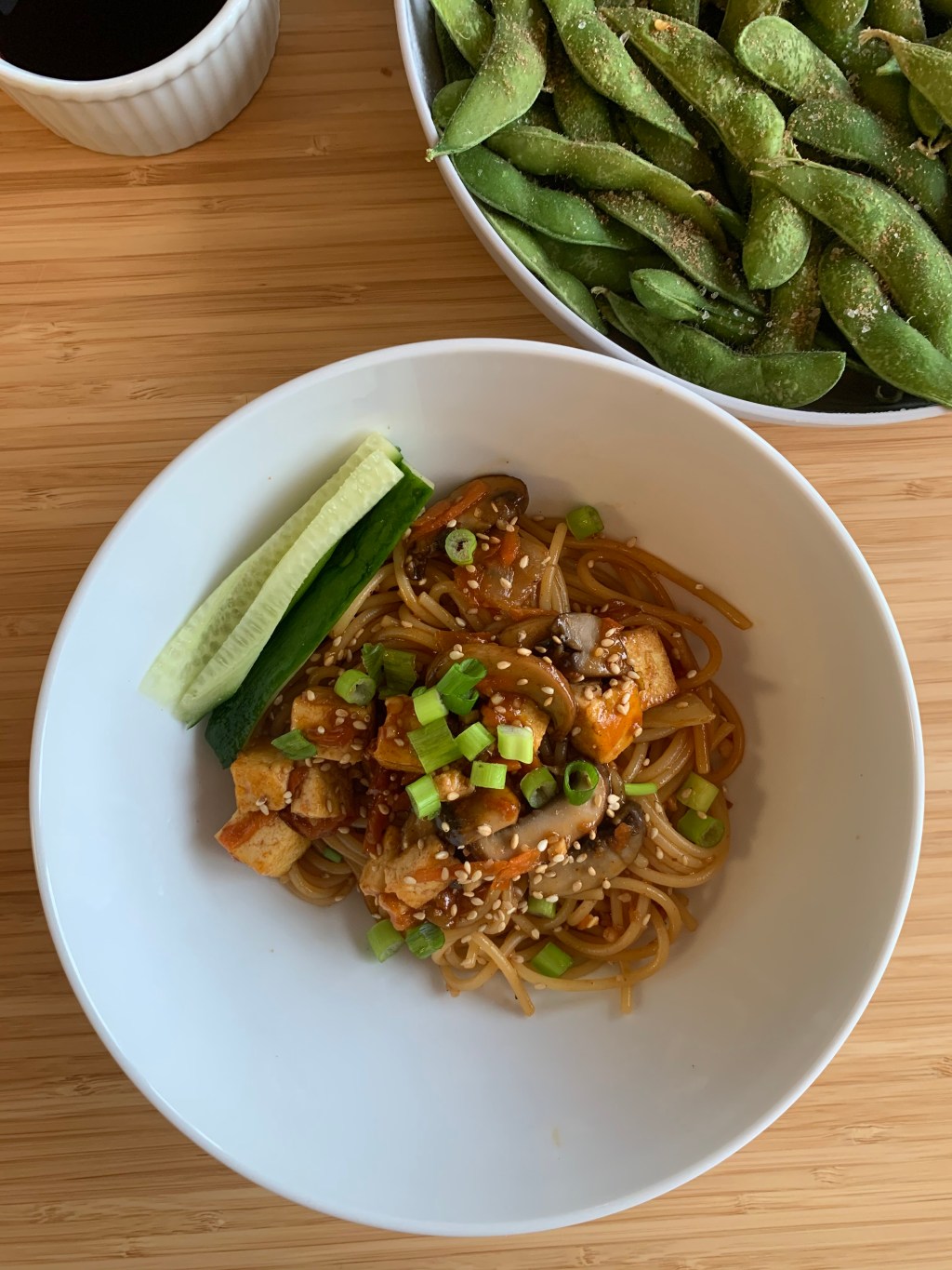 In a pot, pour enough water to cover spaghetti and add at least one tablespoon of salt to water. Turn heat to high. While you’re waiting for water to boil, cut onions, carrot, mushrooms, tofu, garlic, and cucumber. Turn a second burner to medium heat and in a large pan, add about a tablespoon of neutral oil and let heat. Once water is boiling, add noodles and took 1-2 minutes less than instructions read. Once noodles are done, drain and add back to pot you cooked them in. Pour about a teaspoon of sesame oil over noodles, or more if needed, to coat. Set to the side. While noodles are cooking, add onions to pan and saute for about a minute. Push onions to one side and add tofu. Your goal is to get at least two sides of the tofu cube to turn a nice brown and have a slight crisp. Don’t stir the tofu too often. (Tongs work well here). While the tofu is browning, add mushrooms to the onions for about a minute and stir, then add carrots and garlic. Once the tofu is browned, mix all ingredients together and add a teaspoon of soy sauce and a teaspoon of sesame oil. Taste for flavor. Add any spicy ingredient you like, like red chili flakes or sriracha. Add noodles to veggies mix and cook for about a minute until noodles are hot and al dente. Serve with sliced cucumbers or radishes and top with sesame seeds and green onion if you got them.