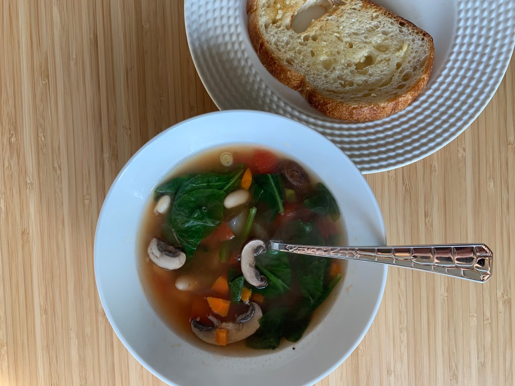 In a large pot, add stock and turn heat to medium high. While waiting for stock to simmer, cut your vegetables. Once stock is simmering, add carrots and onions and cook for about five minutes. Test a carrot. It should still be firm, but starting to cook through. Add beans and tomatoes. Once broth is hot again, test for flavor. Depending on how flavorful your stock is, add salt, pepper, and Italian seasonings to taste. You want your broth to be really flavorful, because, well the vegetables need it. Add mushrooms and frozen veggies and cook for another 2-3 minutes. Finally, tear spinach into bite-size pieces and add to pot. Soup is done once the spinach is wilted. Serve with a sliced of garlic sourdough bread or keep the soup extra healthy and eat as is.