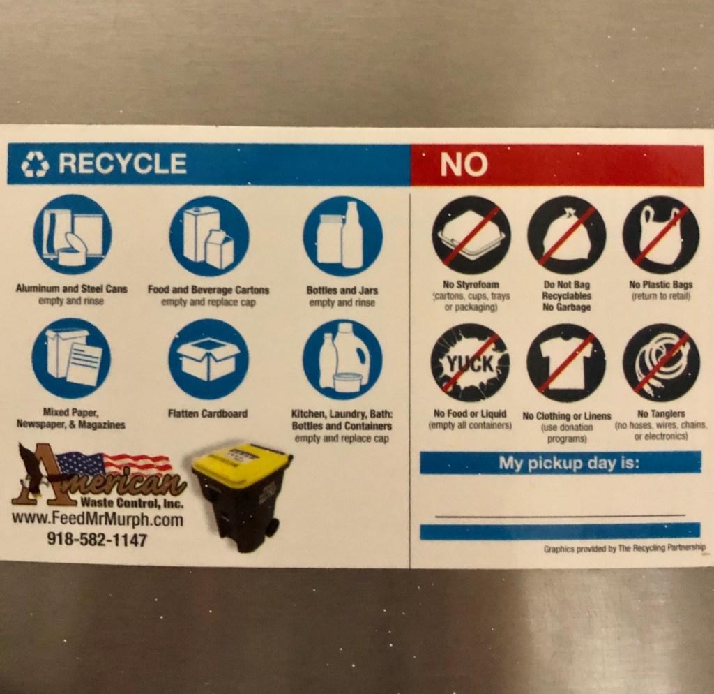 In my curbside bin I am able to recycle papers, flattened cardboard, plastic bottles and jugs, aluminum and steel cans, food and beverage cartons, and glass jars. I keep this little guide on the lid of my trashcan to help remind my family and myself to stop and make sure the item is going in the correct bin before it gets tossed out.