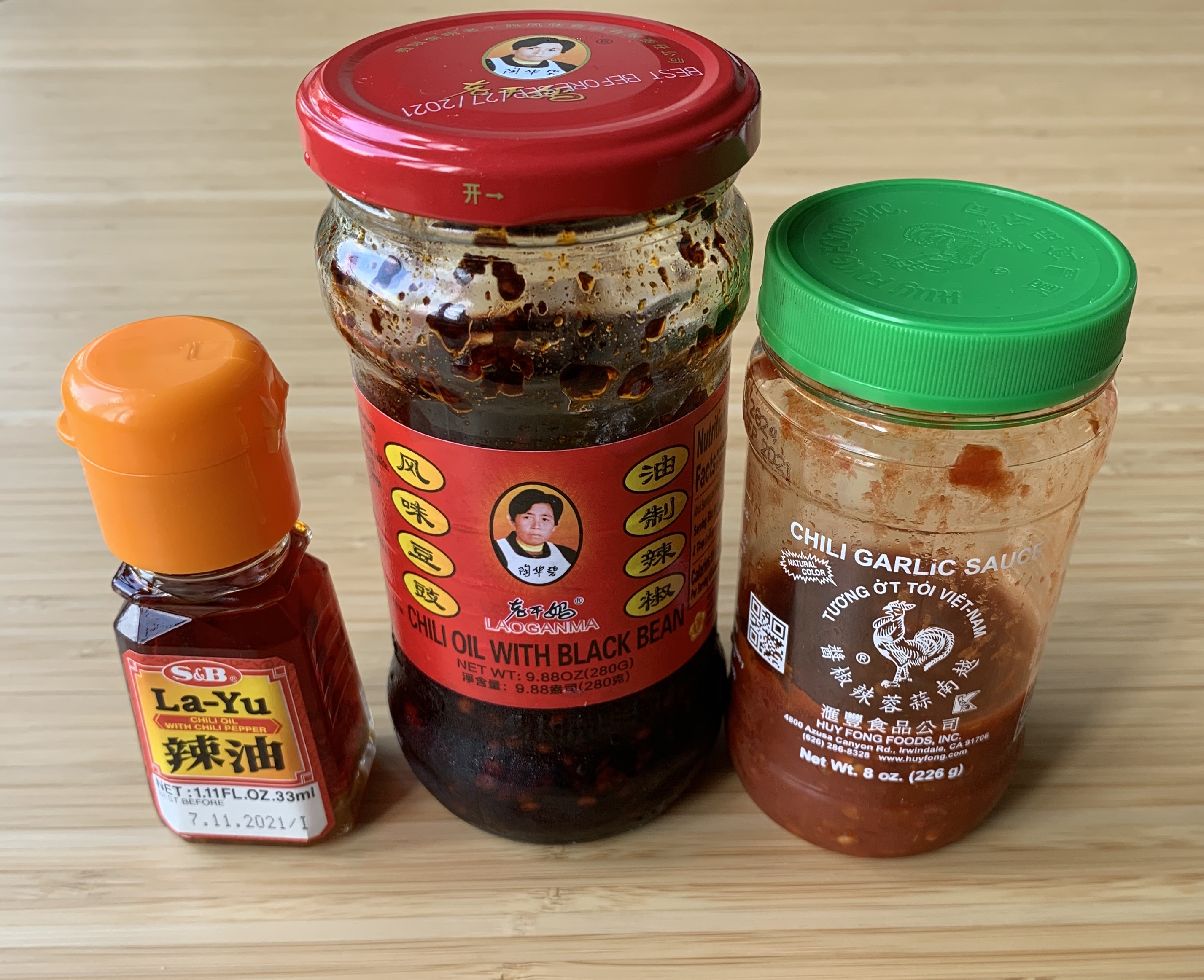 - Chili oil or paste: I don’t normally cook with chili oil from the beginning, but more often add in to middle of cooking or towards the end. I add chili oil to sauces, soups, and on top of dumplings and even eggs. I purchase S&B’s La-Yu (which literally translates to spicy oil) at mainstream grocery stores. It’s strong and last for a long time. Sambal oelek and chili garlic paste (usually in the same style of packaging) don’t have the oil content, but do the same thing as the chili oil and are also easy to find now. A spoonful in most dishes adds just the right amount of heat. My personal favorite is Lao Gan Ma, but you’ll need to head over to an Asian grocery store to find. It has a good amount of oil, but also has these crispy pepper flakes and salty beans that I want to eat every day.