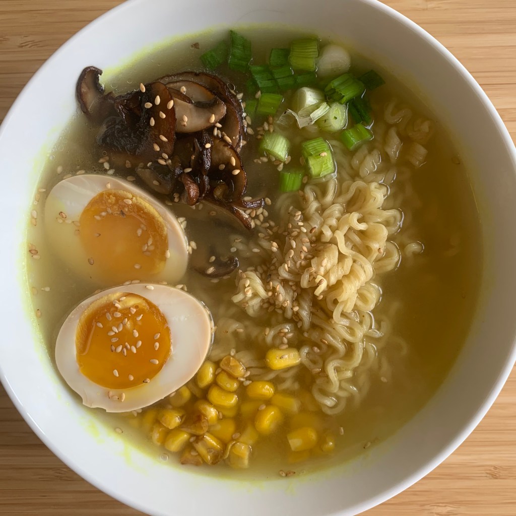 Thursday: B: Overnight oats with raisins and strawberries, lemon water; L: Ramen with soft-boiled egg, soy-sauteed mushrooms, frozen corn and scallions; S: Greek yogurt, granola, nectarine; D: Caesar salad with grilled salmon and peas (mostly going off this recipe, sans croutons).