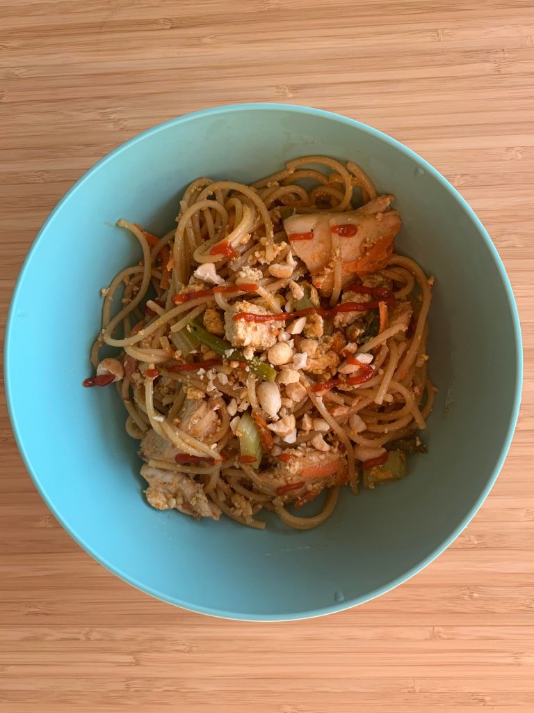Tuesday: B: Two eggs, cream cheese on toast, one nectarine, coffee with milk; L: Miso and dumpling soup with a few frozen dumplings, diced tofu, mushrooms and green onions; D: Chicken and tofu “pad thai” with spaghetti, onion, carrot, asparagus, celery, mushrooms, and peanuts (sauce loosely based off of this recipe).