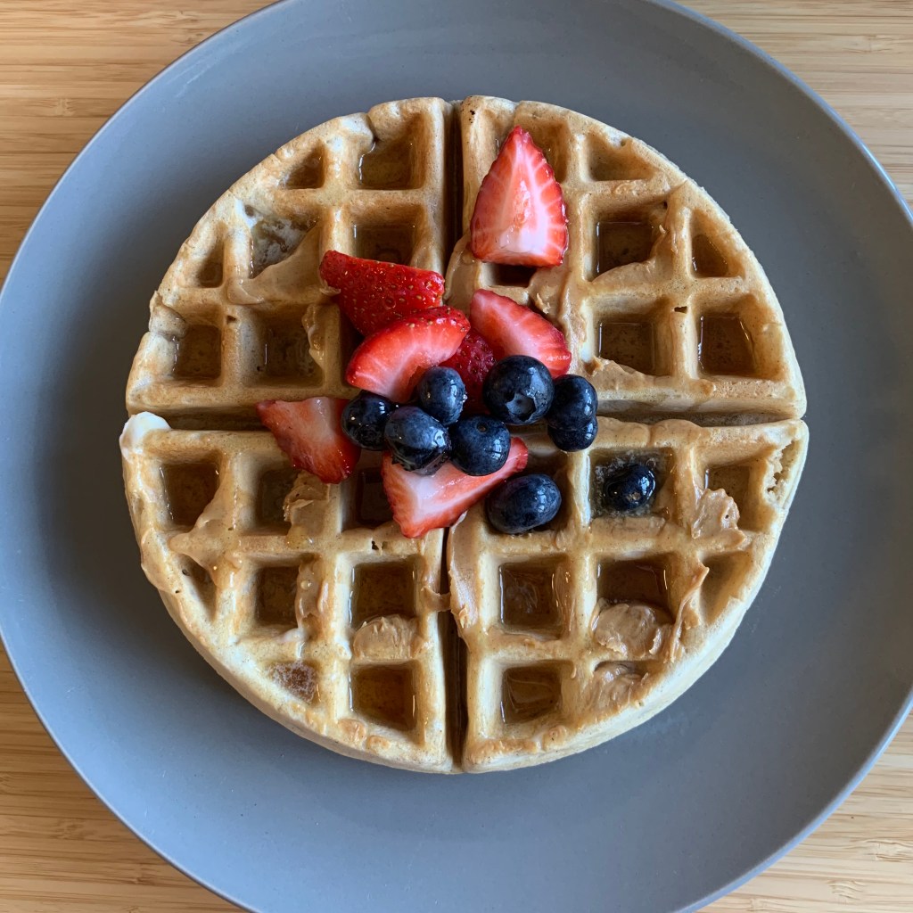 Saturday: B: Homemade waffles with peanut butter, blueberries, strawberries, and maple syrup; L: Baked tofu with the rest of the asparagus and celery with soy sauce and rice; D: Pseudo cacio e pepe but with rice (so it slightly resembled risotto. I got the idea from this recipe), peas, and two grilled salmon patties.