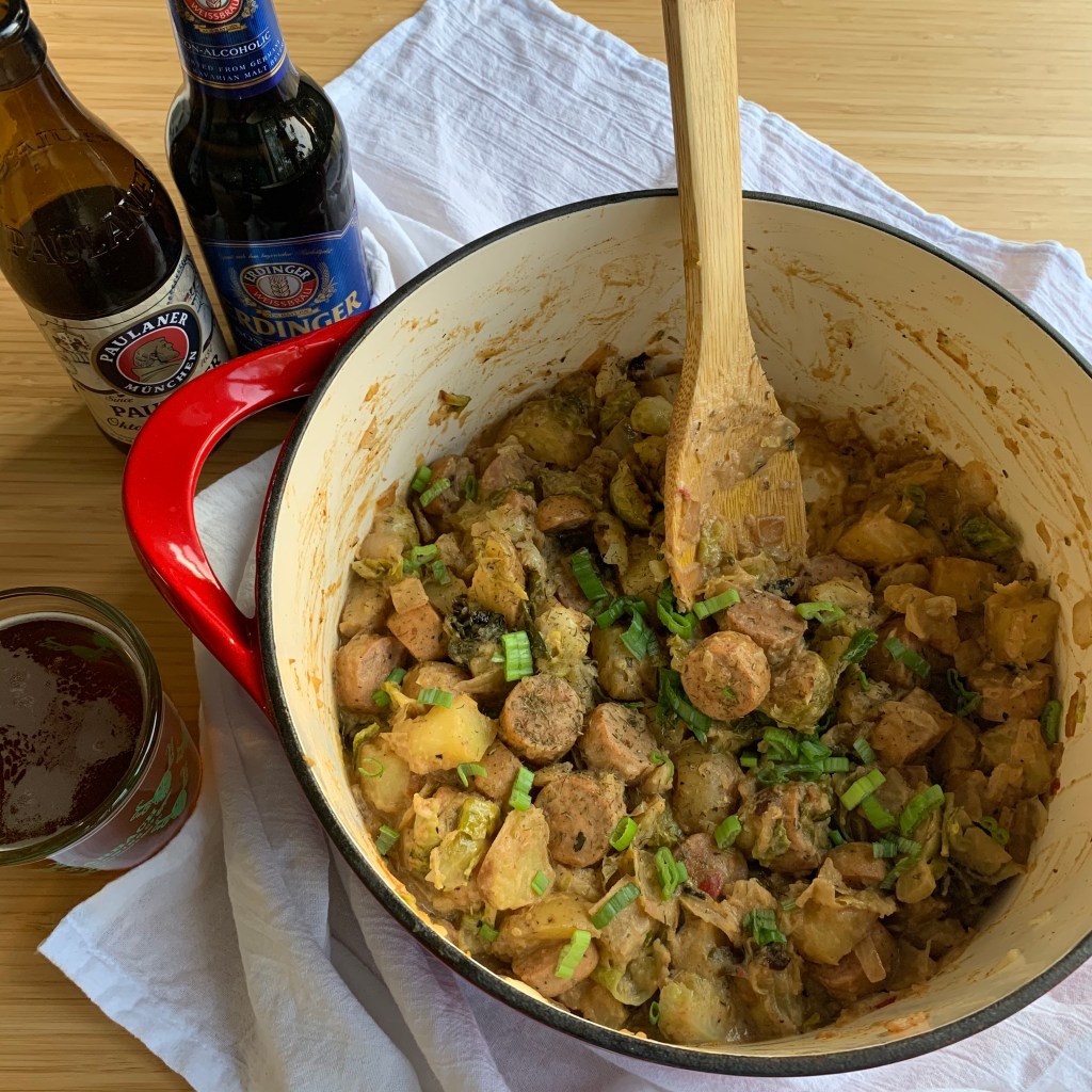 Preheat the oven to 400F. Cut potatoes into ½ inch pieces and cabbage into 1 inch pieces (brussels sprouts in half). Place on a baking sheet with olive oil, salt, pepper, rosemary, and paprika. Bake for 25-30 minutes, mixing once, until potatoes are fork-tender. Wait about 15 minutes while potatoes and cabbage are in the oven, then start the rest of the dish. In a large pot over medium heat, add olive oil and onions and cook for 5 minutes. Cut sausage into ½ inch thick coins and cook until both sides are brown, about 7 minutes. Add cooked potatoes and cabbage to the pot. Add beef stock and simmer for about 3 minutes, then lightly mash about a fourth of the potatoes to help create a thick sauce. Add mustard, maple syrup, and sauerkraut, then cook for one minute. Turn heat to low, and add sour cream. Taste for more salt, pepper, and paprika. Top with fresh and dried herbs.