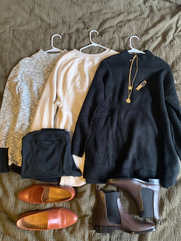 - Weekend errands/lunch with friends: Black jeans or thick leggings, long sweater/turtle neck, sneakers or ankle boots.
