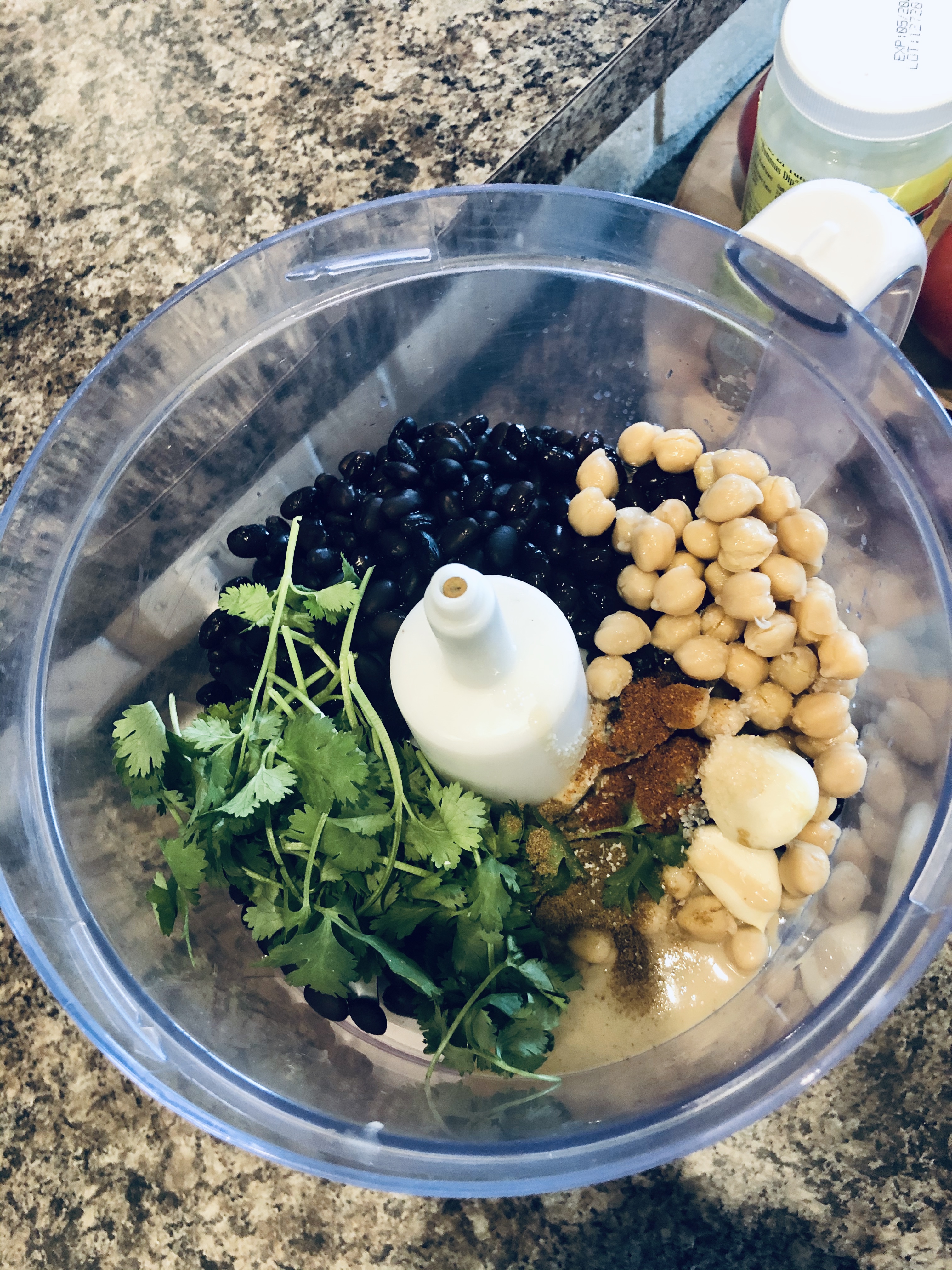 Drain and rinse both the chickpeas and black beans then place them into a food processor along with garlic, tahini, lemon juice, cumin, coriander, and salt and pepper. Replace the lid and pulse while slowly pouring in the EVOO. Once smooth, transfer to an airtight container and store in the refrigerator for 5 to 7 days. If you would like, you can also add in jalapeno.