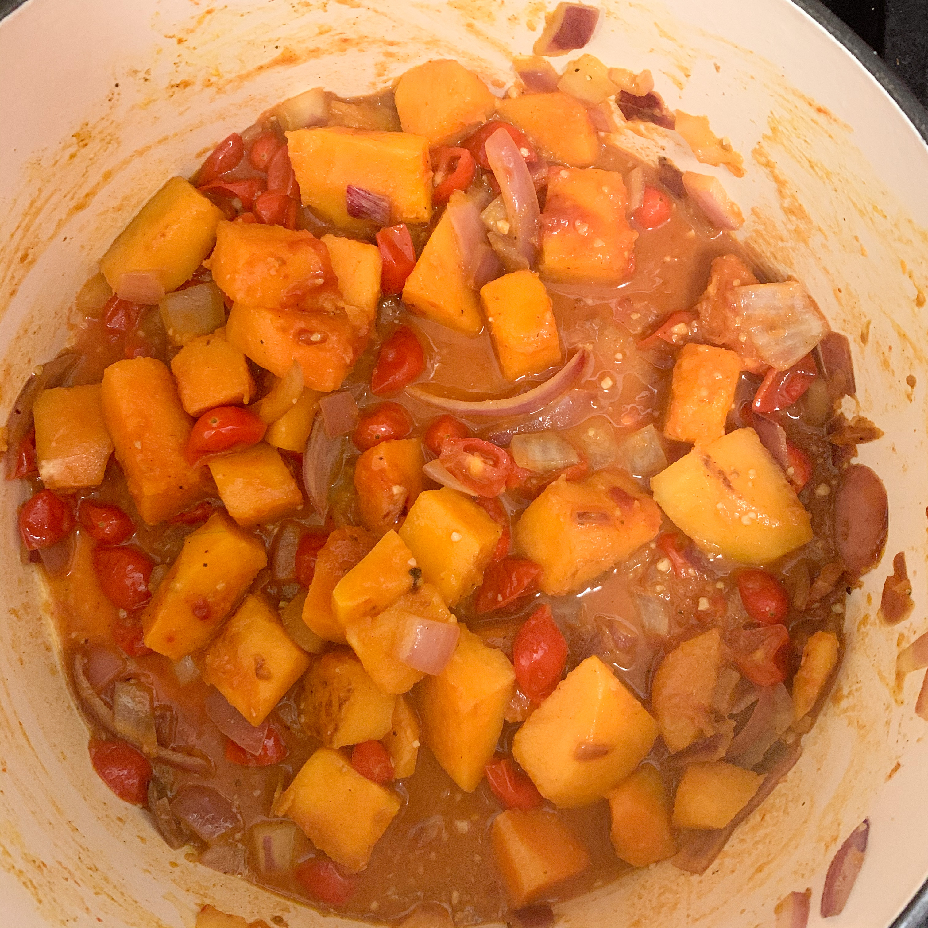 Pumpkin mixture: In a Dutch oven or a large pot, head oil to medium. Add pumpkin and let cook until some corners start to brown, about 10 minutes. Add onion and cook for 5 more minutes. Sprinkle in sugar and cinnamon and stir. Let cook for another 5 minutes then add tomatoes and pepper. Cook and stir for a few minutes. Then add 1 cup of broth, tomato paste, and spices. Stir a few times to incorporate and cover with lid. Turn heat to low and cook for 20 minutes. Check mixture, add more broth if sauce is too thick and starting to burn in pot. Cook for another 10 minutes if needed. Pumpkin should very easily be pierced with a fork when done.
