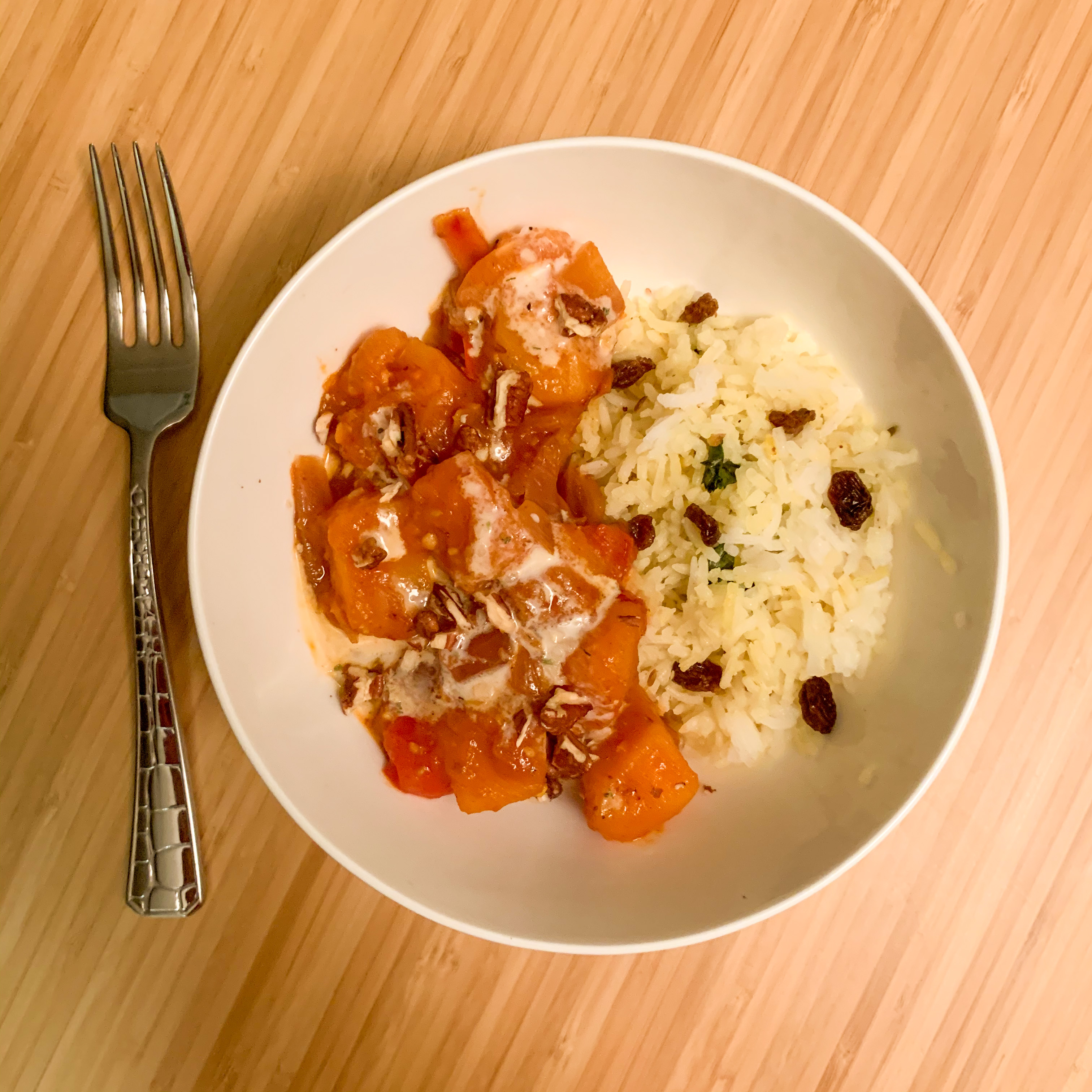 Once pumpkin is cooked, transfer to a large bowl and drizzle yogurt sauce on top. Top with other items like nuts or cilantro if desired. Best served with warm bread, like pita, or rice pilaf.
