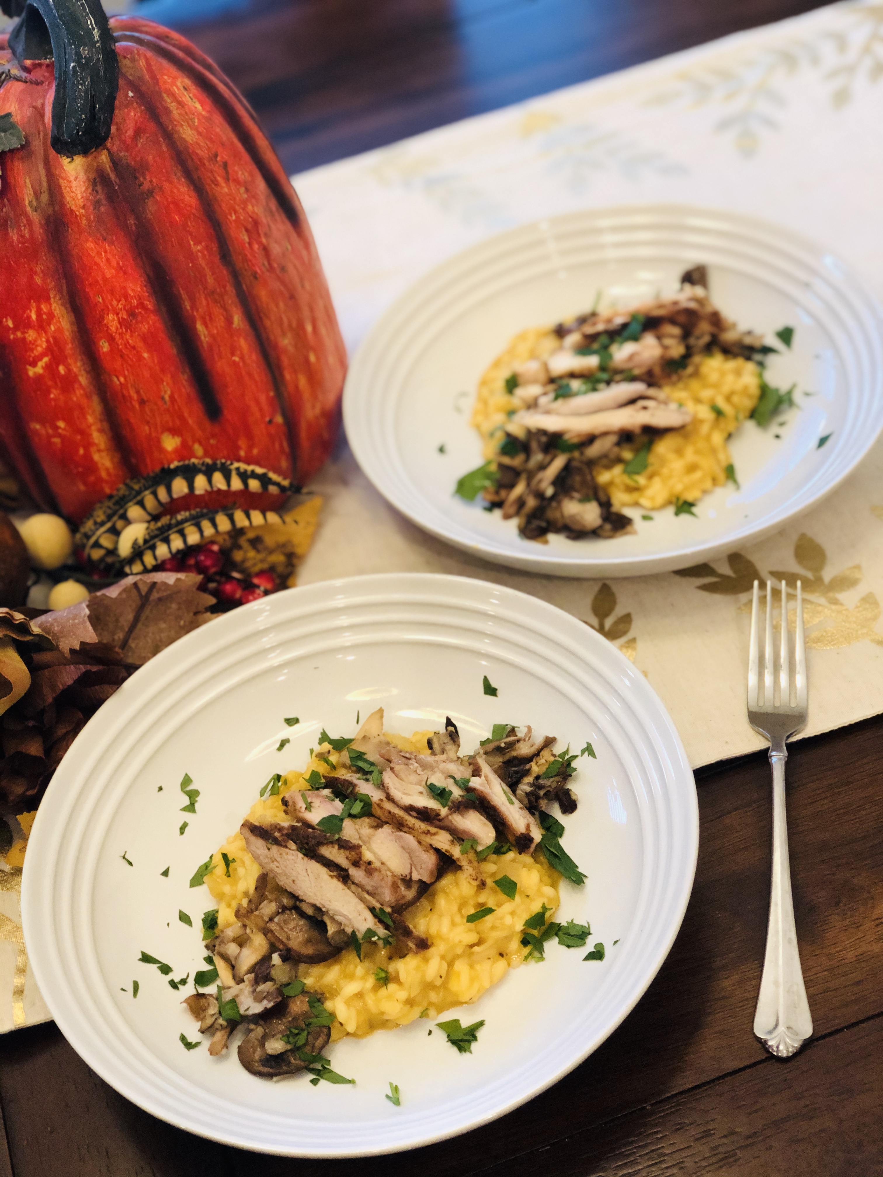 To make this more of a well rounded meal, I topped the pumpkin risotto with a sautéed mushroom mix and slices of baked chicken thighs. I prefer to sauté my mushrooms with garlic and a dash of balsamic vinegar or red wine. For the chicken thighs I used seasonings that would well complement and balance the pumpkin such as rosemary, cayenne, and cardamom. I used about a tablespoon of rosemary and 1/4 teaspoon each of cayenne and cardamom along with salt and pepper. Ever since our post, The Spices Collecting Dust, I have been trying to incorporate cardamom into more of my cooking. In that post it is explained that cardamom and cinnamon compliment each other well, and since I used pumpkin pie spice in the risotto I figured it would be a good opportunity to use cardamom. Next time I make this pumpkin risotto I plan to serve it alongside lamb because rosemary and cardamom are commonly used to season that meat and it is one of my husbands favorites.