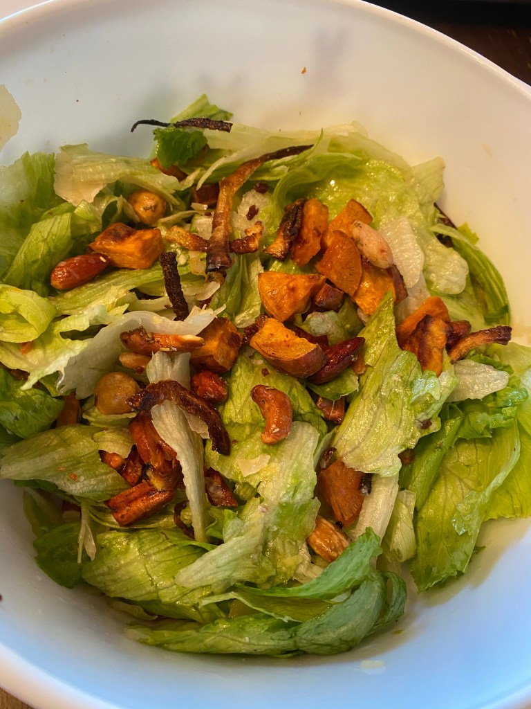 Speaking of complimenting the meal, one of the great things about making a salad like this is that the recipe is very flexible. You can swap things you don’t have or like and make it to your taste, or better yet, use it as a nice mixture of the best parts of your other dishes. For example, if you have extra ingredients lying around, like cheese, crispy onions, roasted vegetables (like Brussel sprouts as mentioned above), etc., you can build it based on that- just be sure it pairs well with sweet potato.