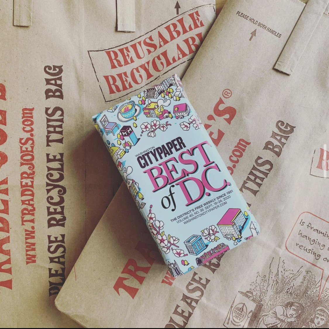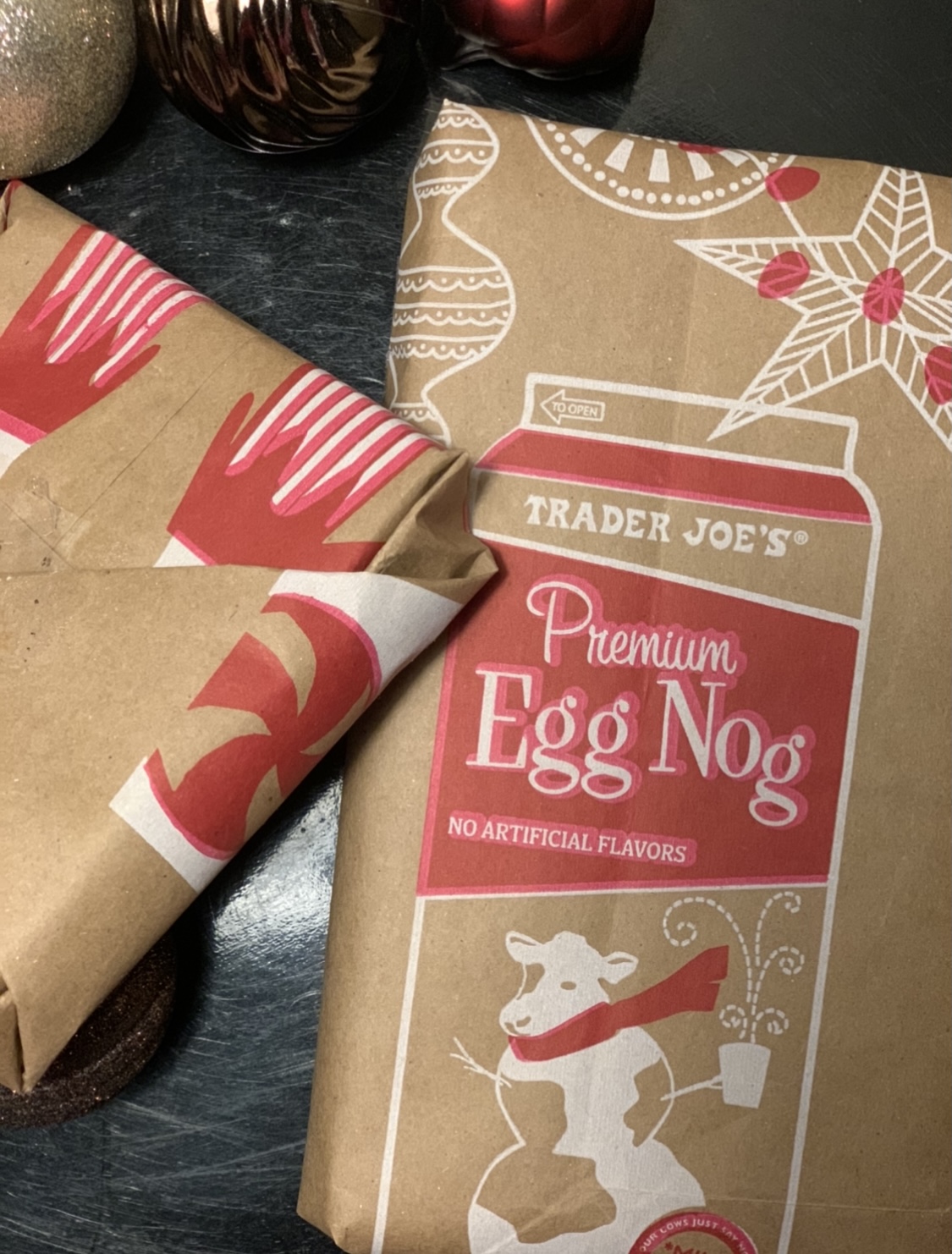 - paper grocery bags: I don’t know about you but I’ve been getting a lot of groceries lately, and I have quite the paper bag collection. I normally just use them as trash bags when cooking, but I think they are nice for wrapping as well. If you cut them and use the inside as the outside of the wrapping, it looks like rustic paper wrapping, or maybe the bags you have, have a cute design on them like the ones above from Trader Joe’s.